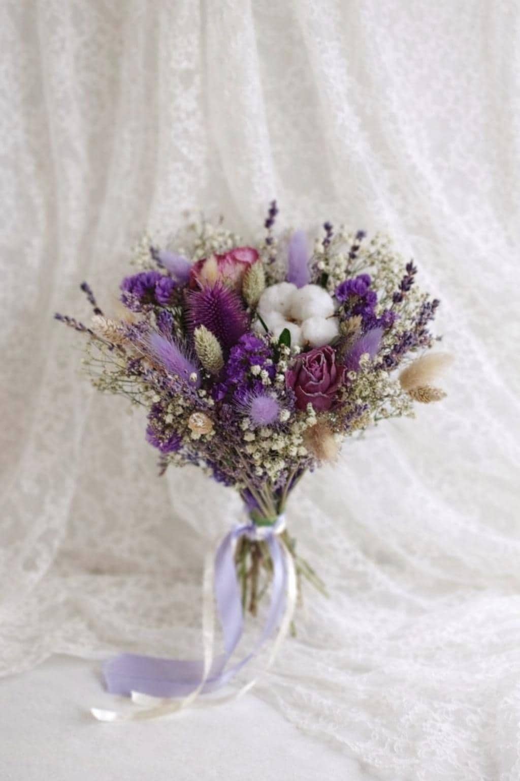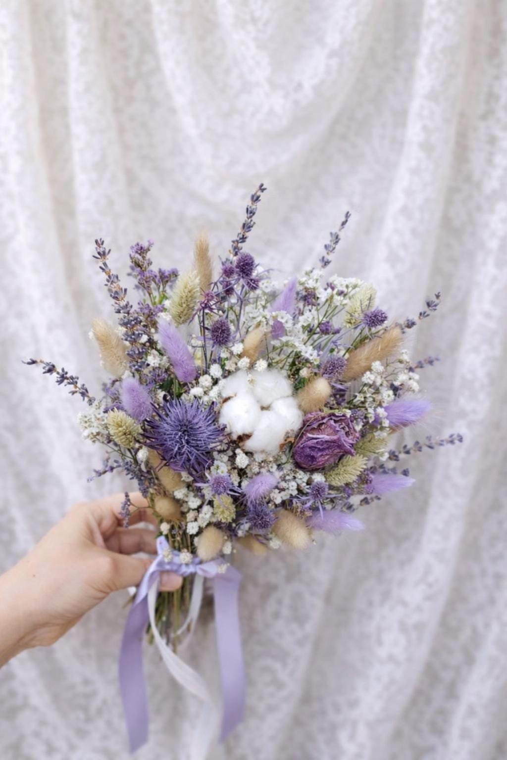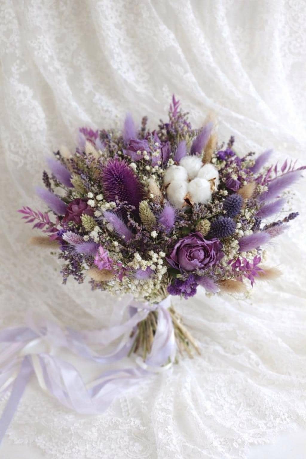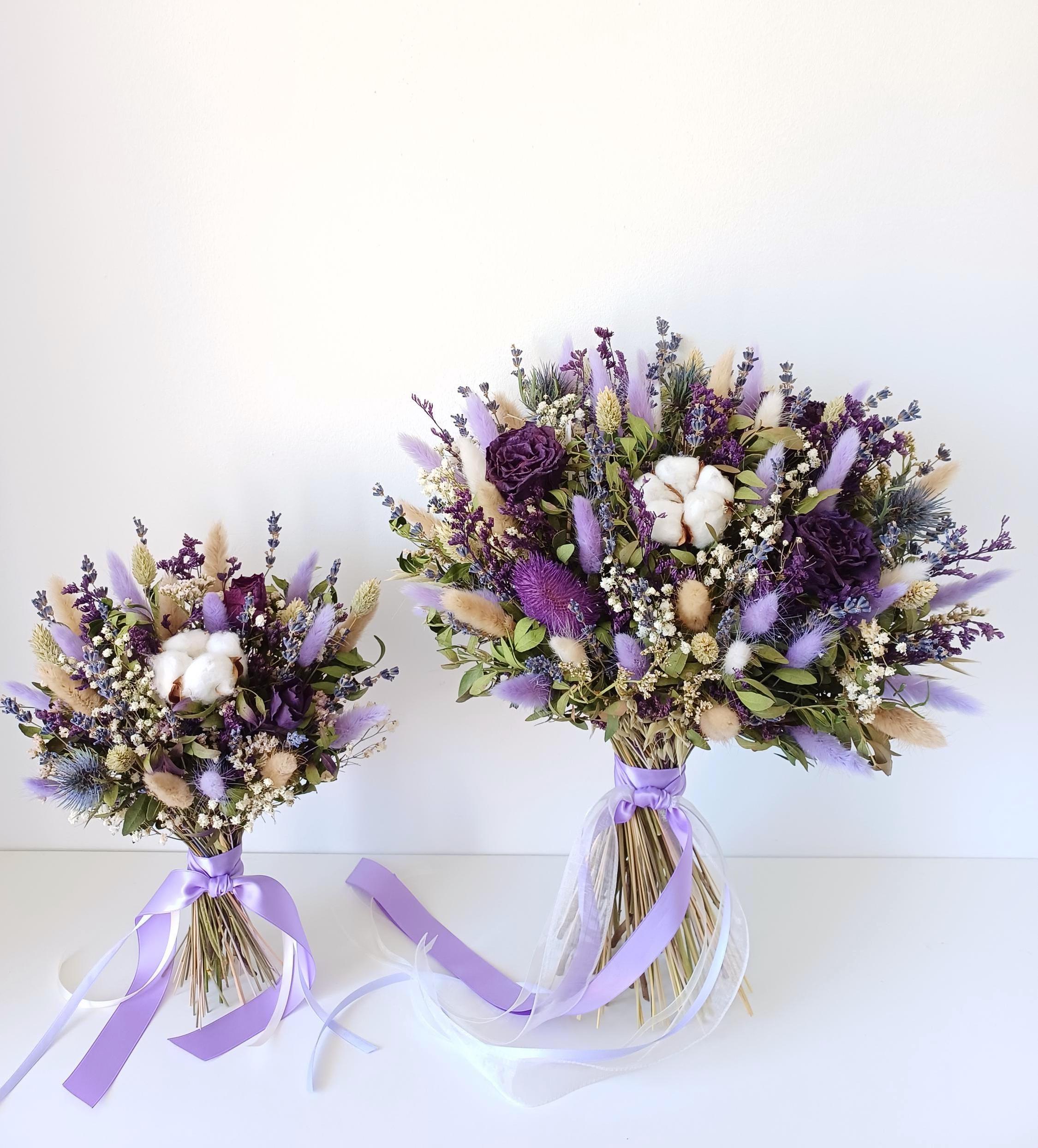 Dried Wedding Bouquets in Purple Scottish style carefully arranged with preserved and dried florals in rich shades of lavender, lilac, and deep purple. The bouquet features delicate textures reminiscent of Highland meadows. Natural elements such as dried grasses, thistle-inspired blooms, and soft cotton accents create an organic, rustic feel, while the muted purple palette adds a sense of noble charm and calm sophistication.