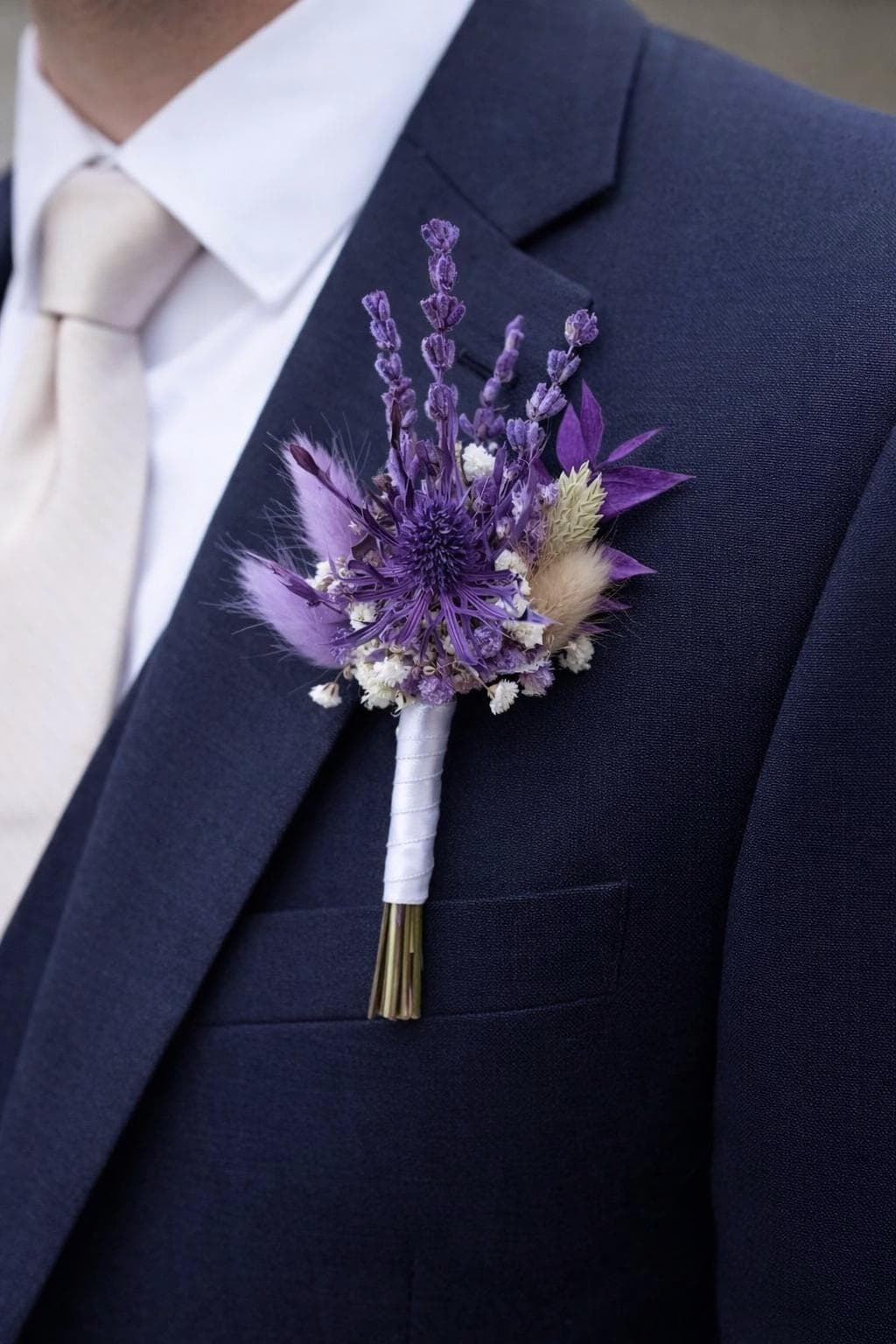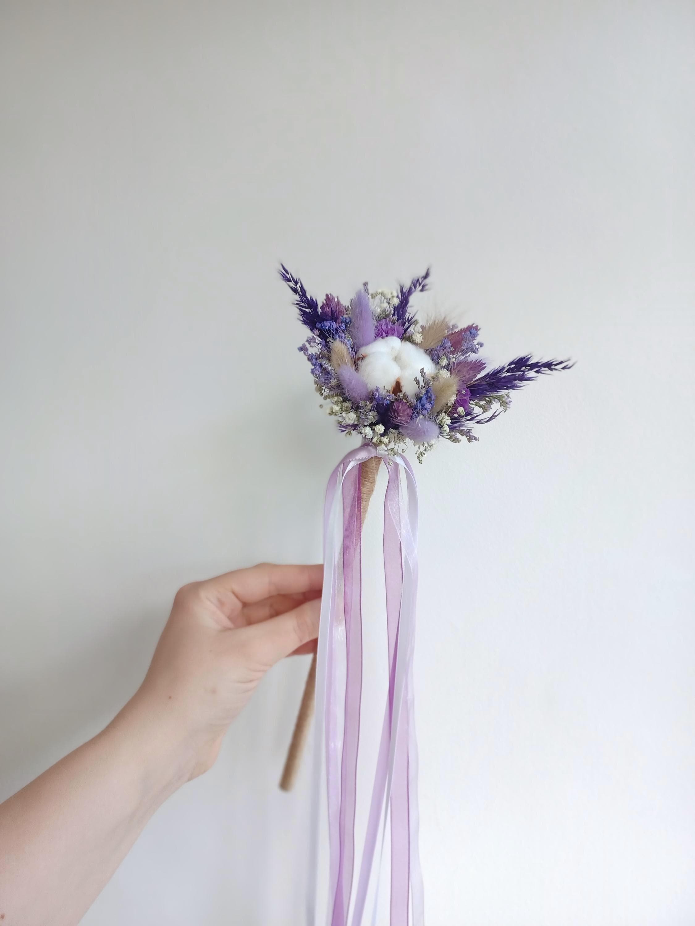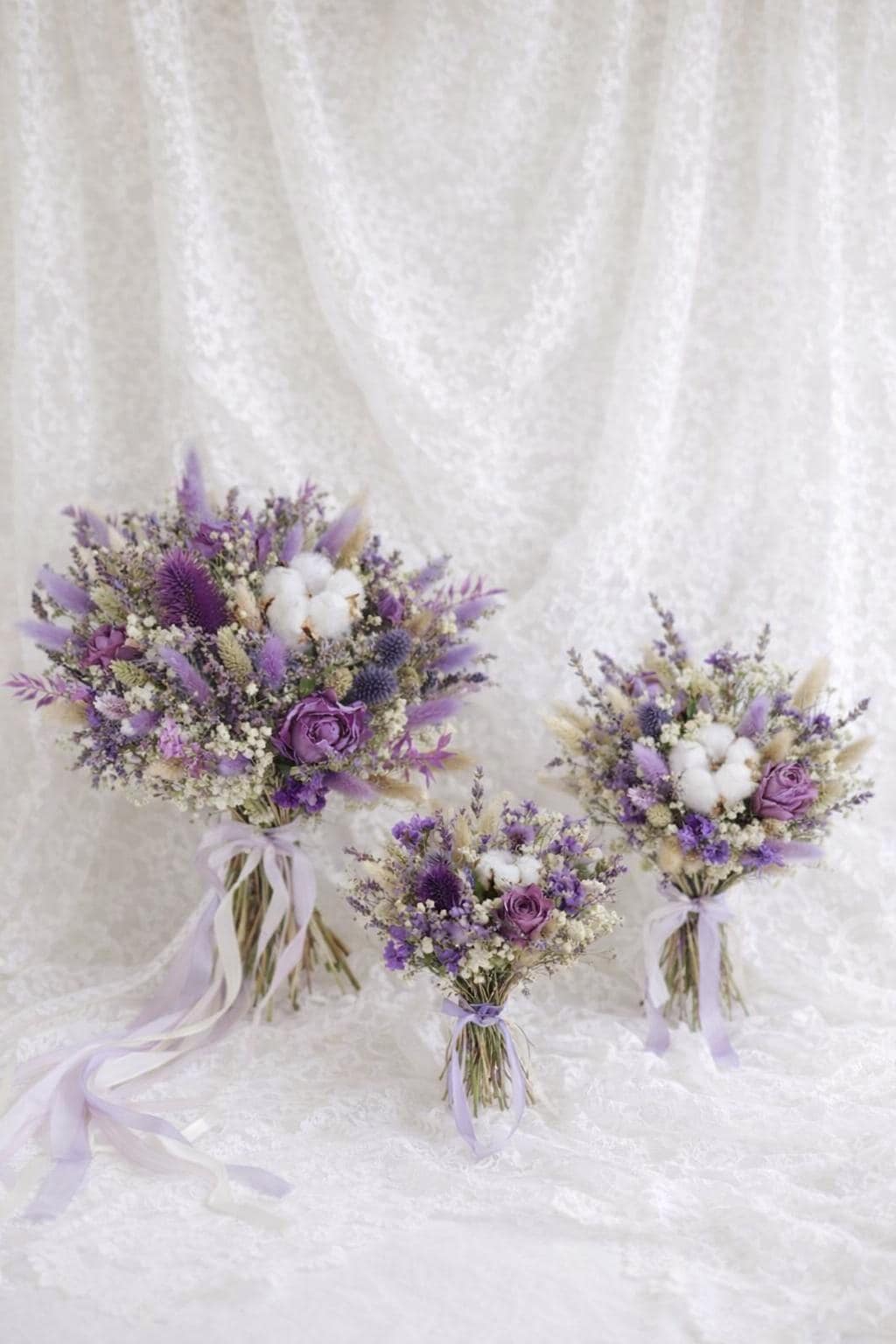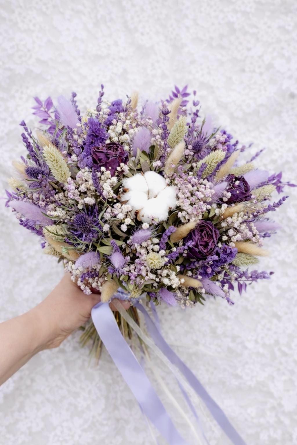 Dried Wedding Bouquets in Purple Scottish style carefully arranged with preserved and dried florals in rich shades of lavender, lilac, and deep purple. The bouquet features delicate textures reminiscent of Highland meadows. Natural elements such as dried grasses, thistle-inspired blooms, and soft cotton accents create an organic, rustic feel, while the muted purple palette adds a sense of noble charm and calm sophistication.