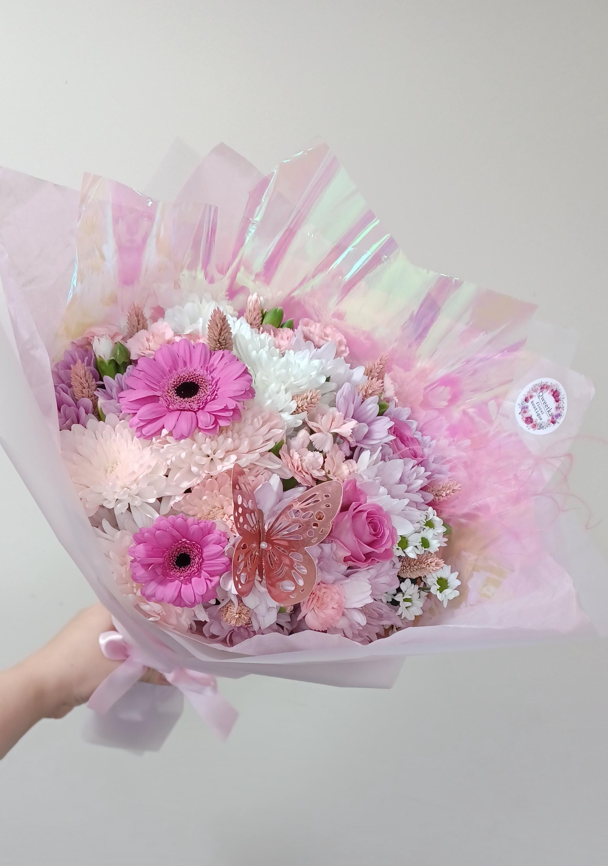 The bouquet includes a mix of live seasonal flowers in pink and white colours. All flower bouquets are made-to-order and not pre-made. Flowers last for 5-7 days and more, if you follow all florist's recommendations for flower care. Gift cards (if needed), flower food, a bag and care recommendations are also included.