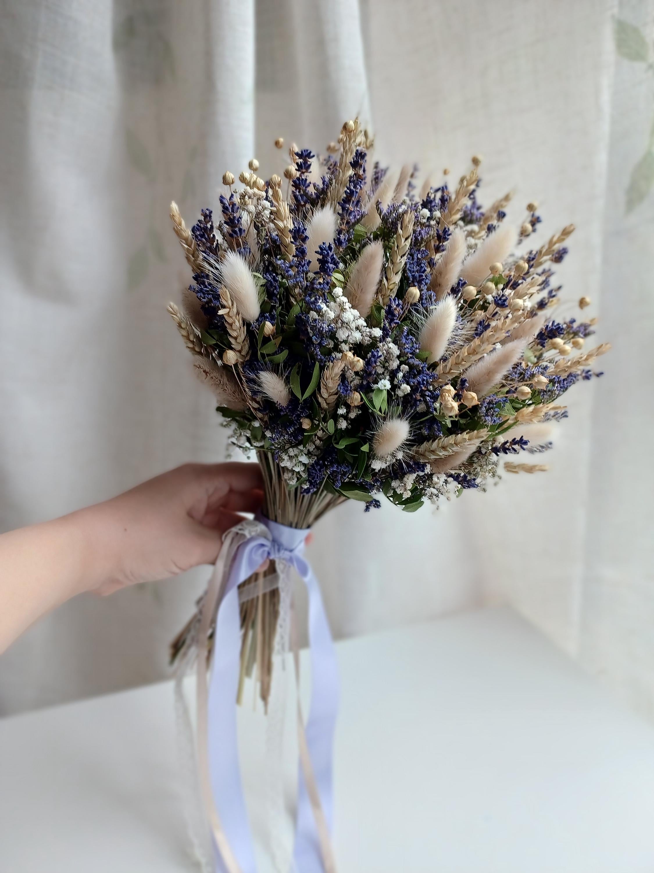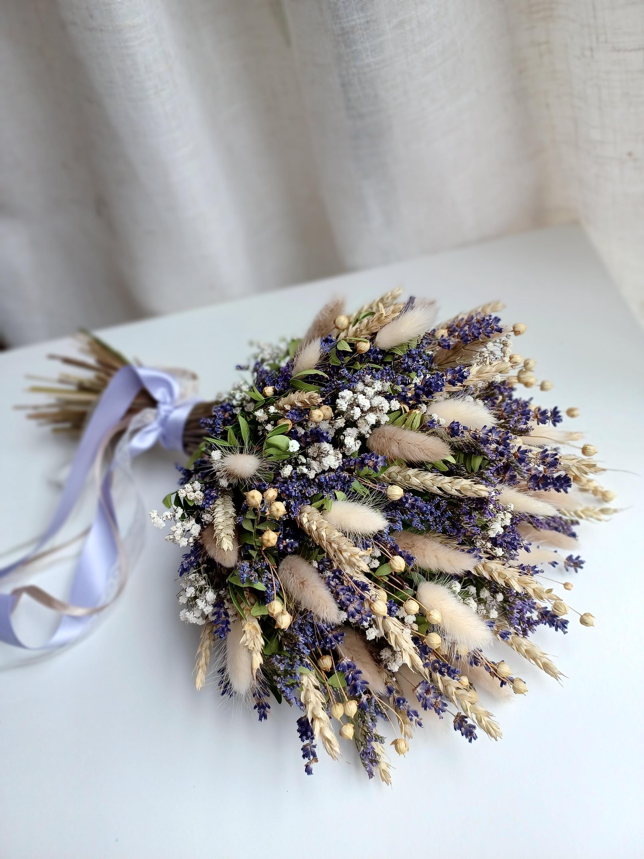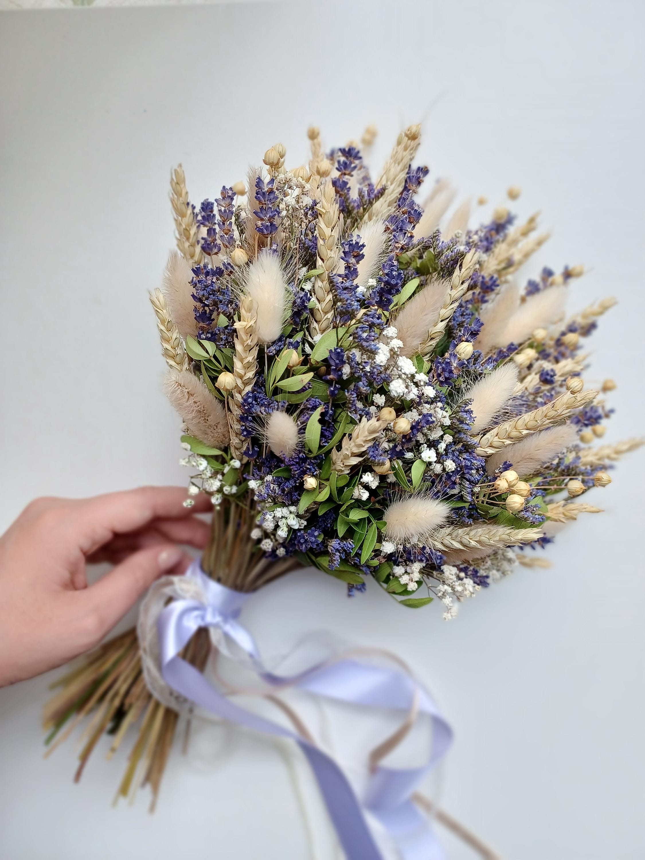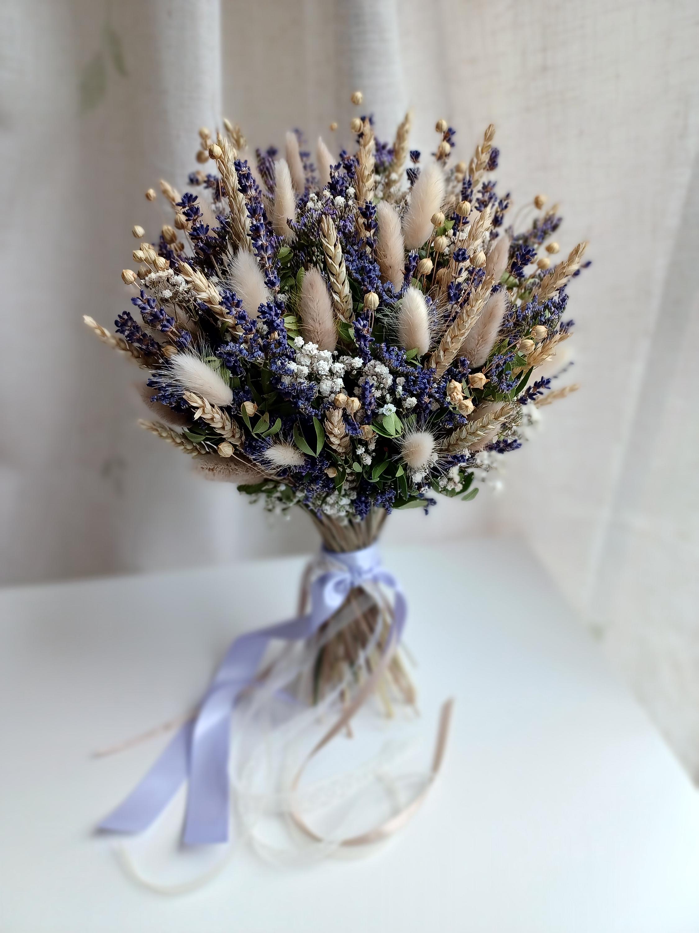 The bouquet includes wheat, bunny tails, lavender, limonium, gypsophila (Baby's breath flowers ).