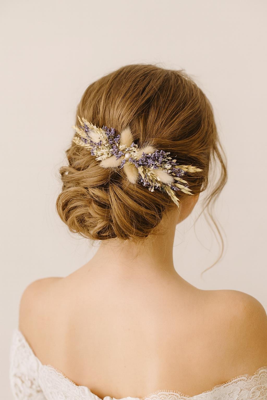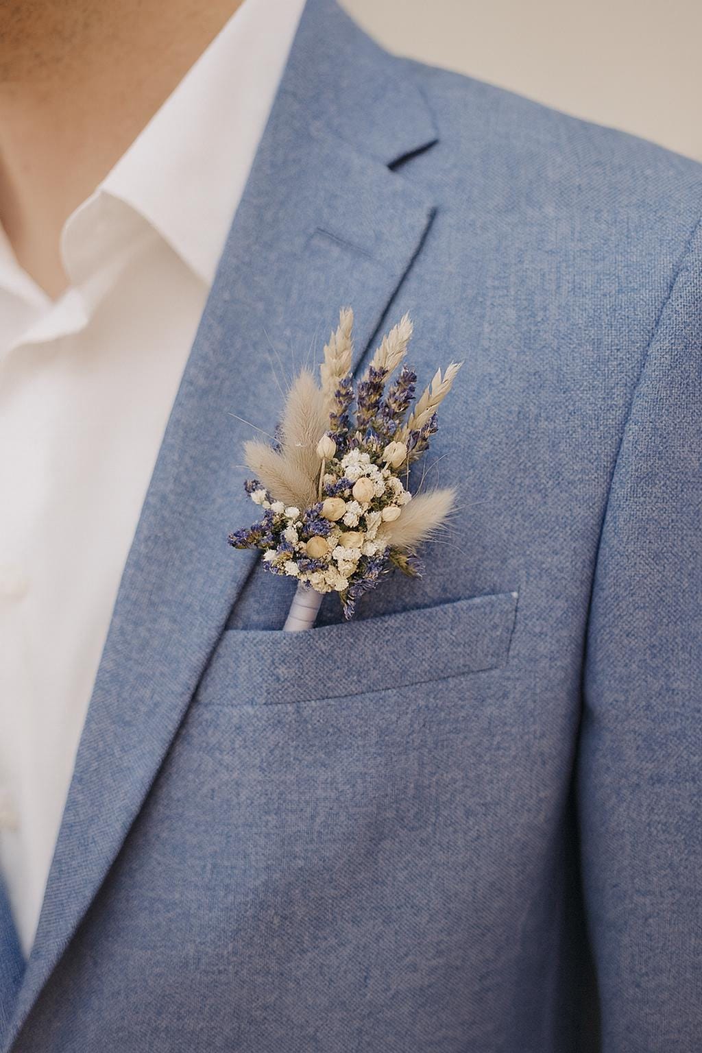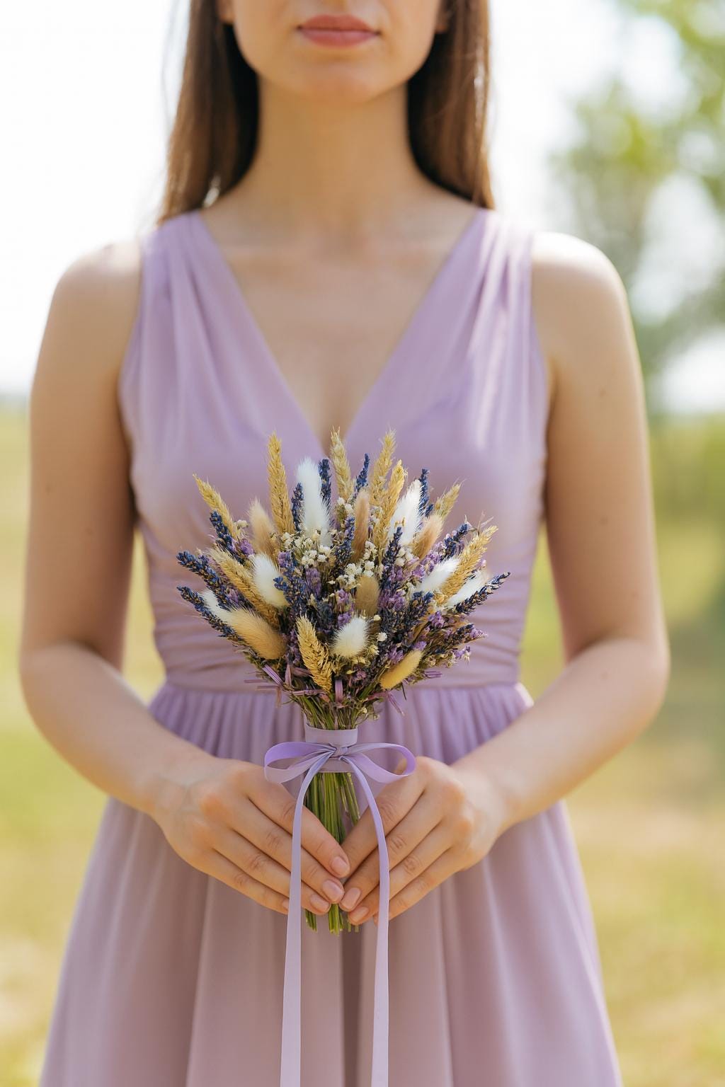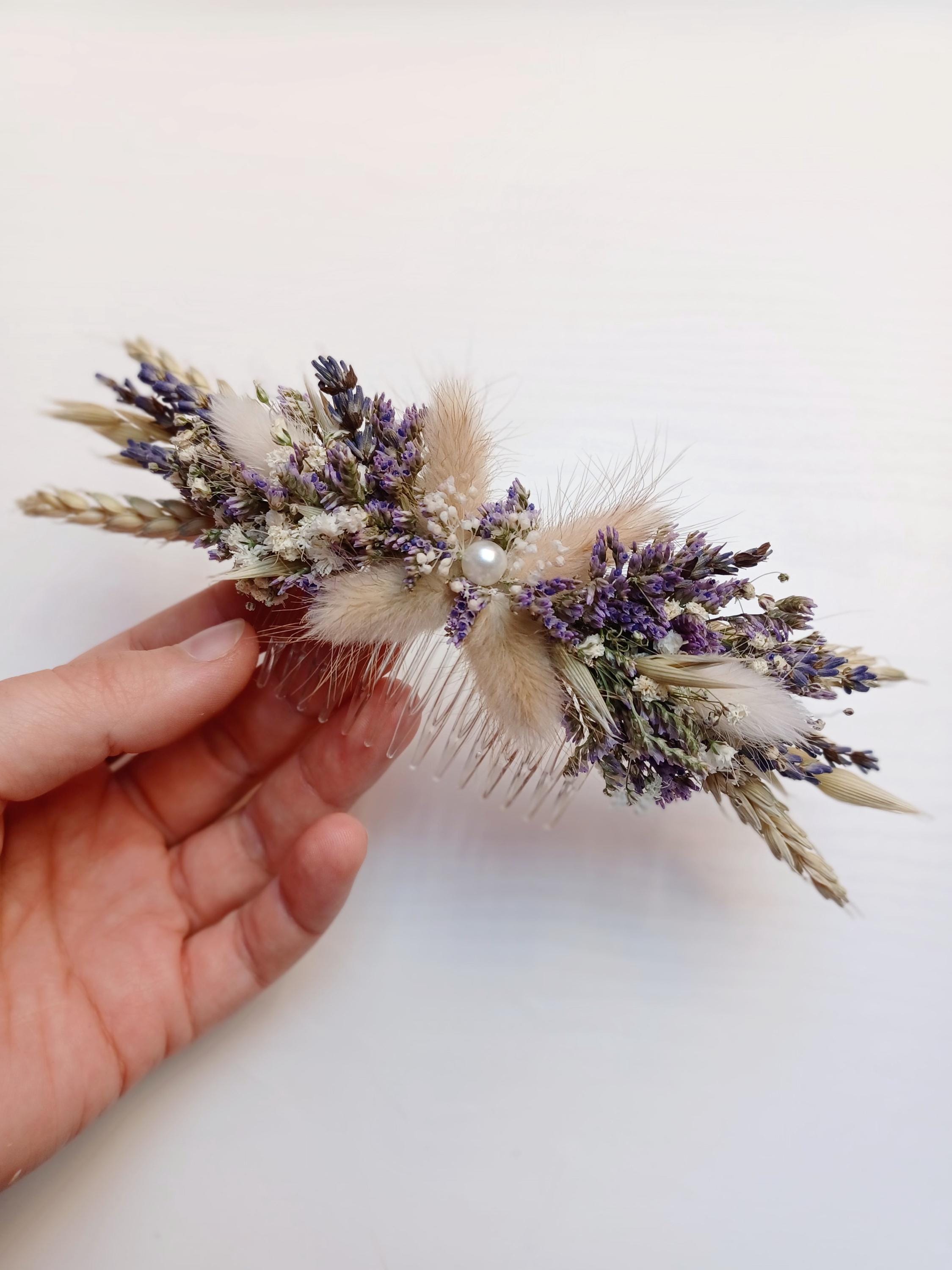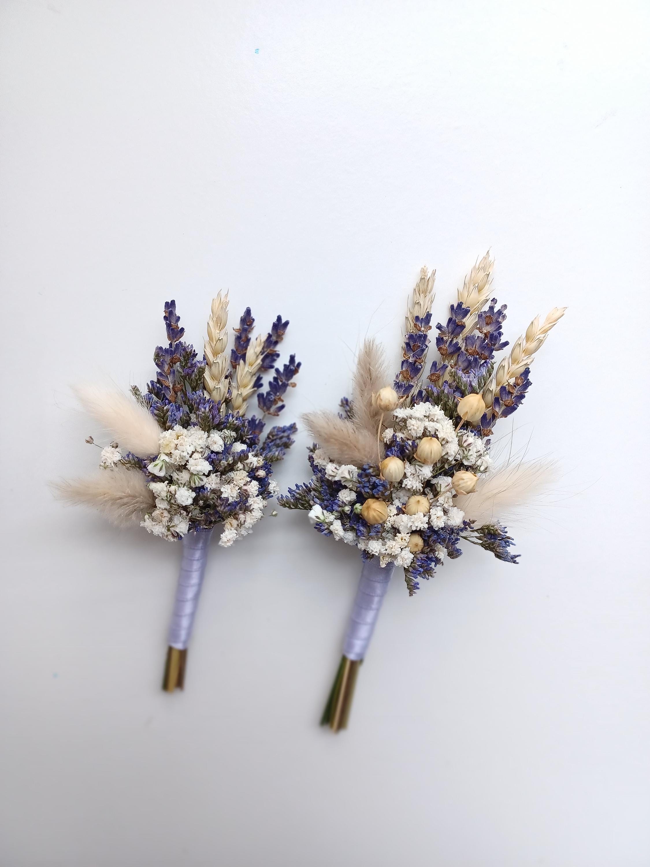 The bouquet includes wheat, bunny tails, lavender, limonium, gypsophila (Baby's breath flowers ).