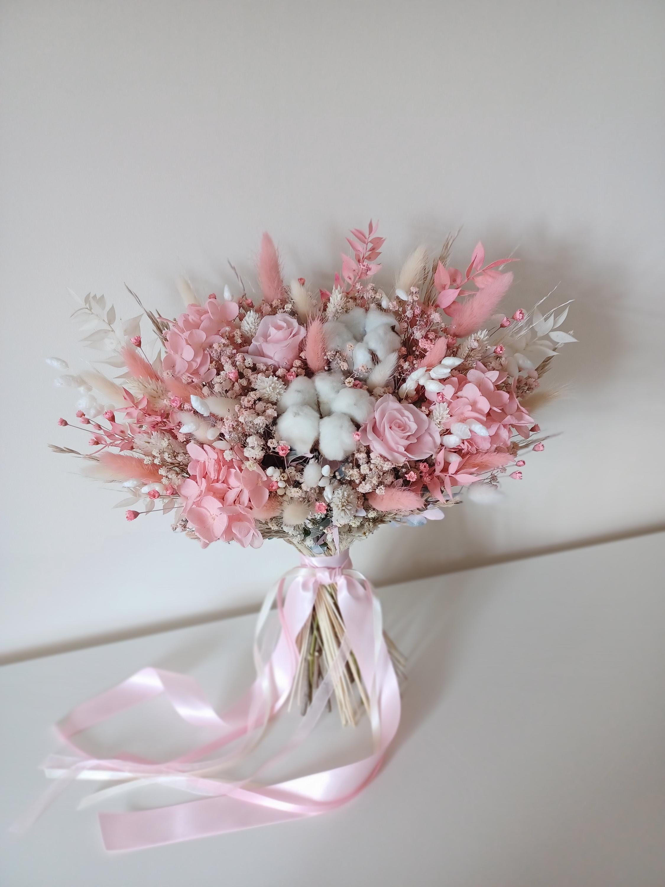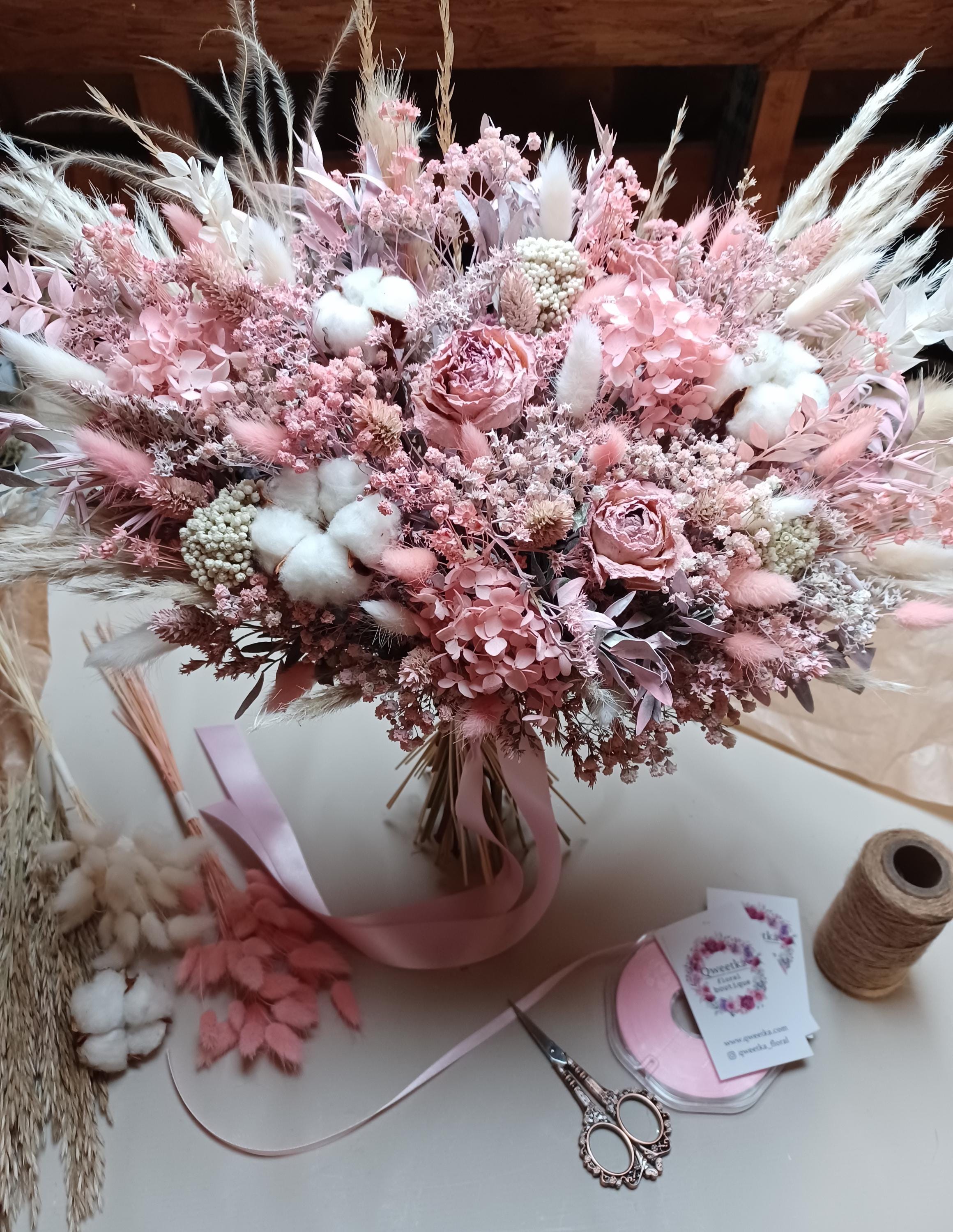 Cotton, phalaris, preserved roses, lagurus, pampas grass, ruscus, limonium, gypsophila (baby's breath).
