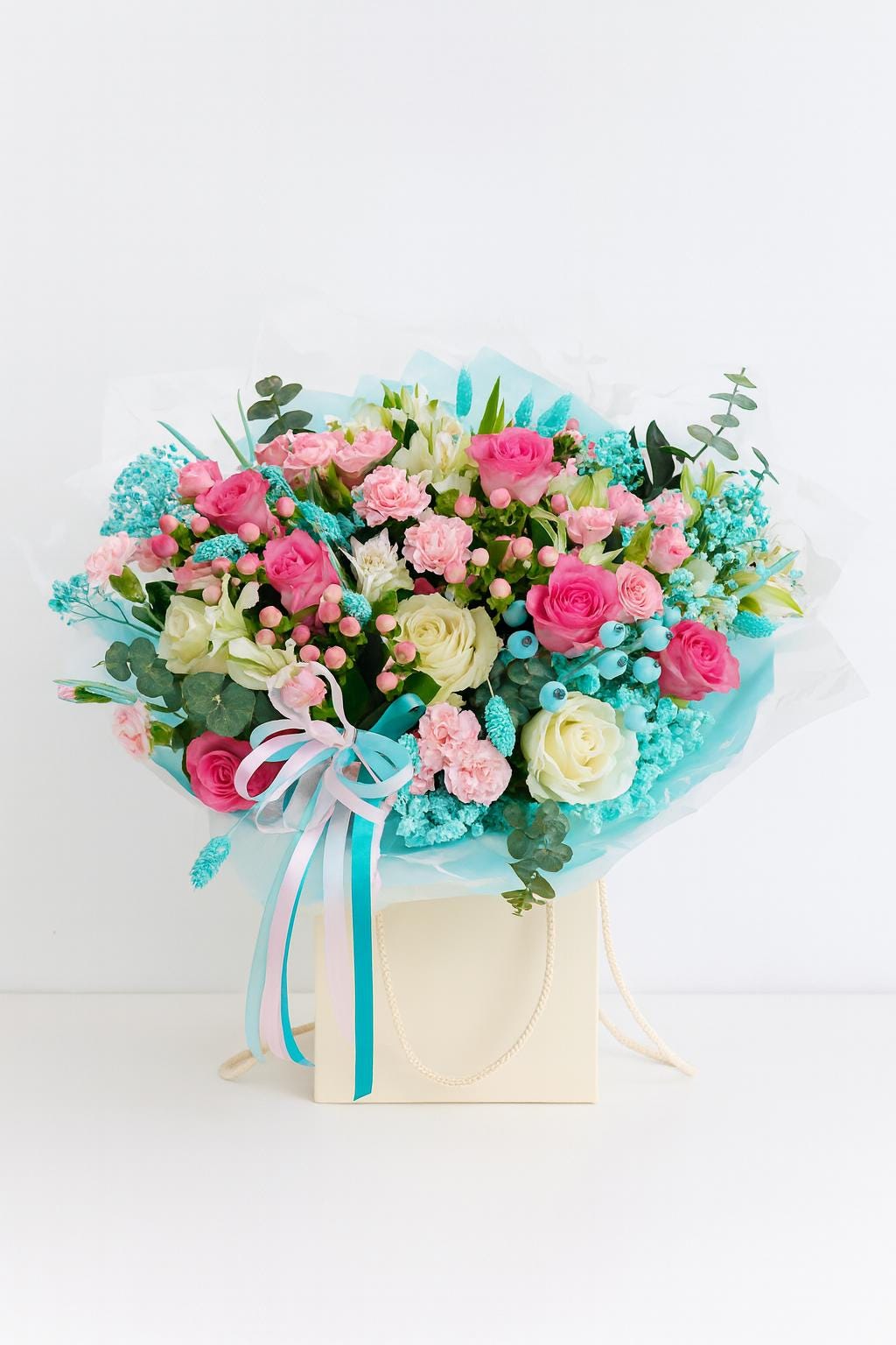 The bouquet includes live seasonal flowers in pink, tiffany and white colours. All bouquets are made-to-order and not pre-made. Flowers last for 5-7 days and more, if you follow all florist's recommendations for flower care. Gift cards (if needed), flower food, a bag and care recommendations are also included.
